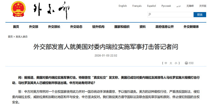 问:据报道,美国对委内瑞拉实施军事打击。特朗普在“真实社交”发文称,美国已成功对委内瑞拉及其领导人马杜罗实施大规模打击行动,马杜罗及其夫人已被控制并移送出境。中方对此有何评论?